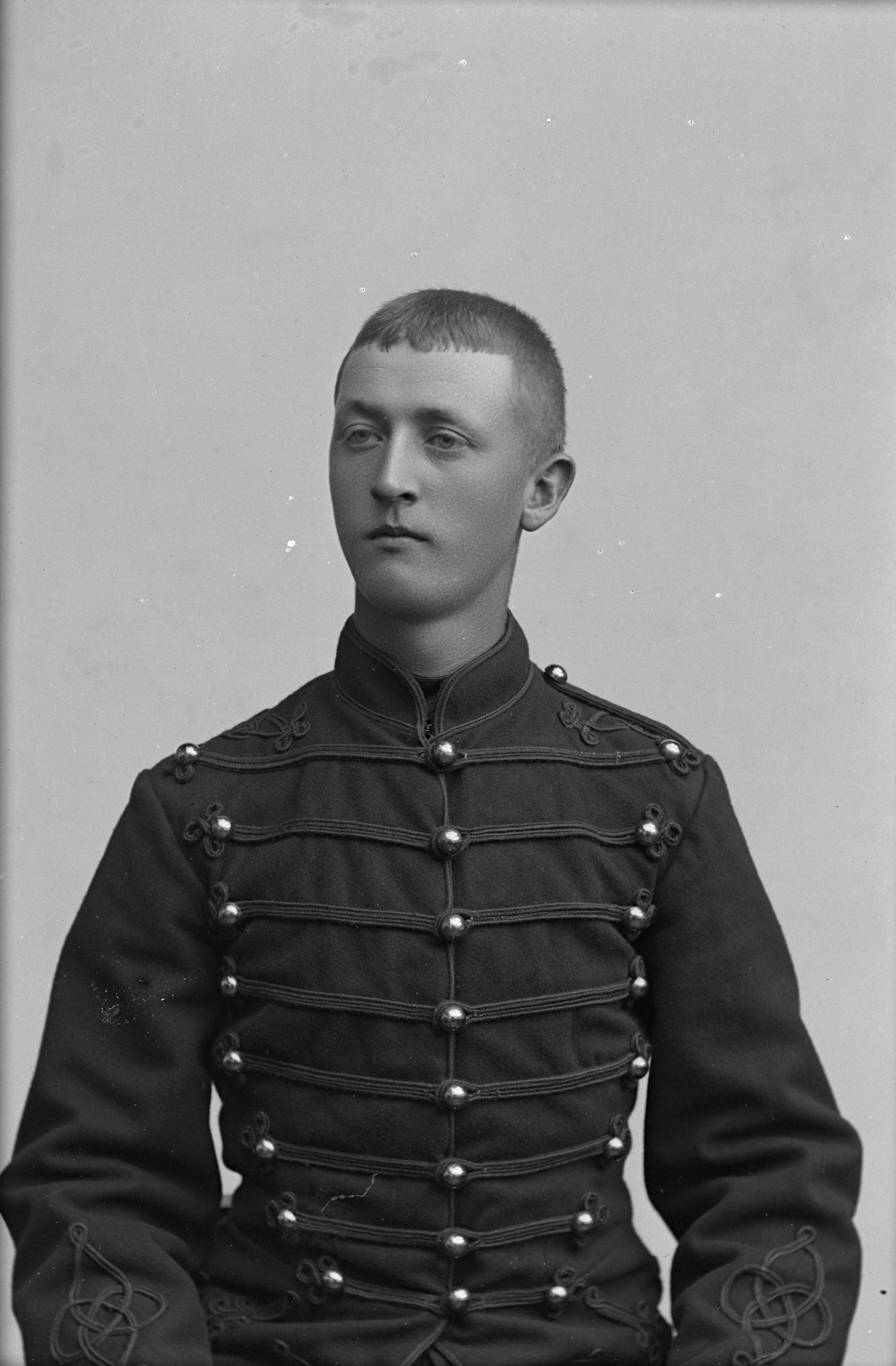 Porträtt halvfigur av husar Lind, iklädd militäruniform.
