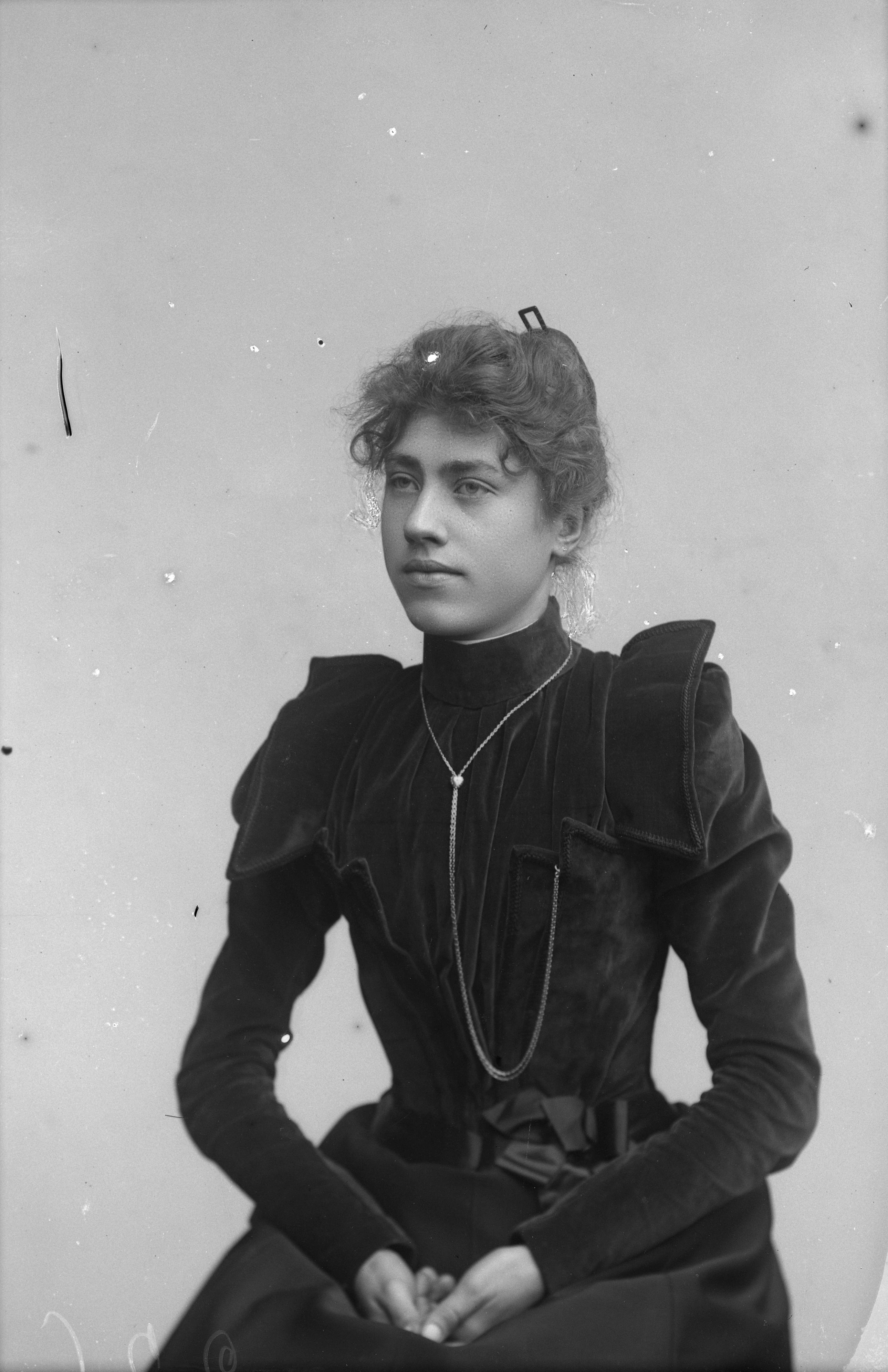Beskrivning: Porträtt i halvfigur av Ida Falk.