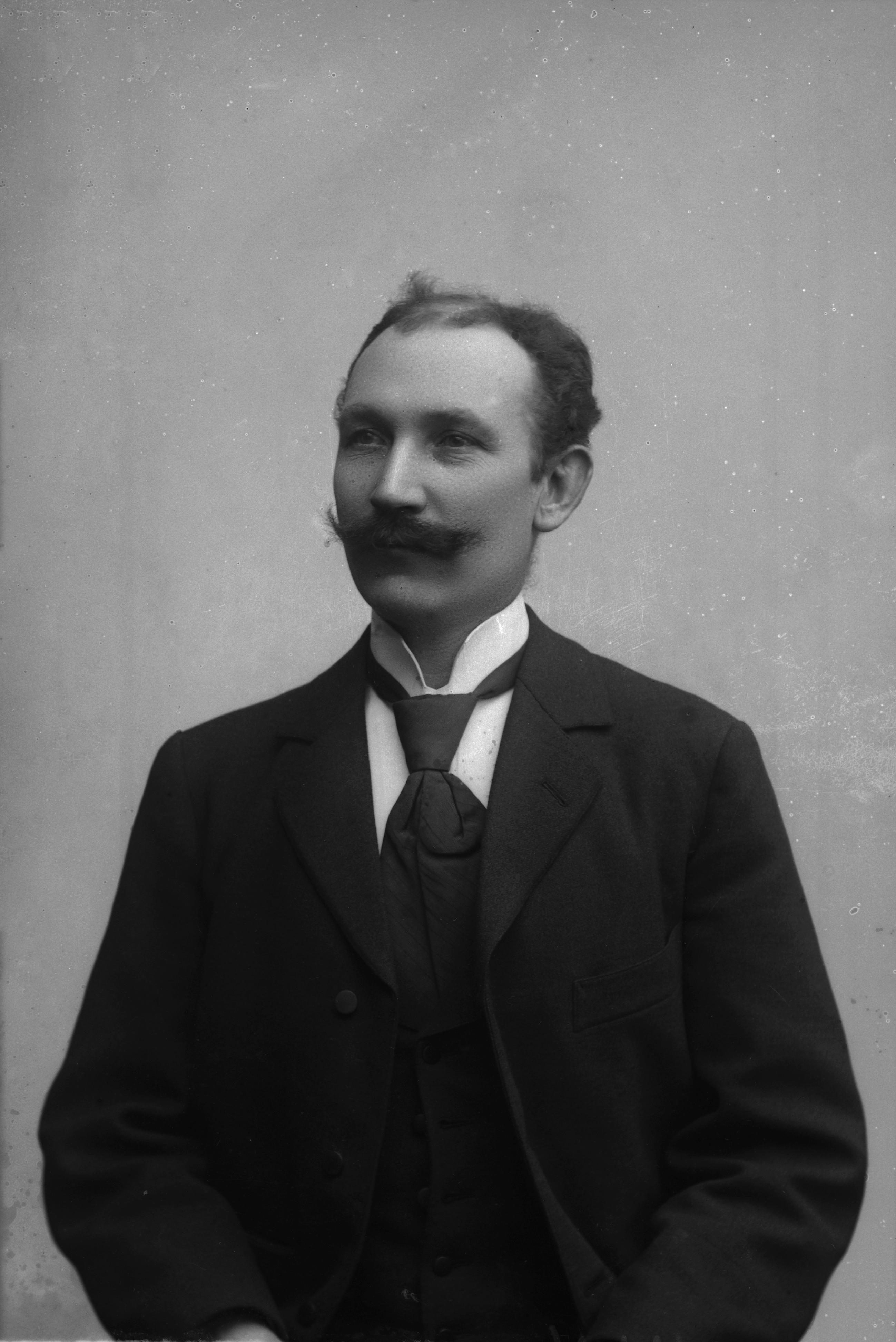 Beskrivning: Porträtt i halvfigur av O. Alm.