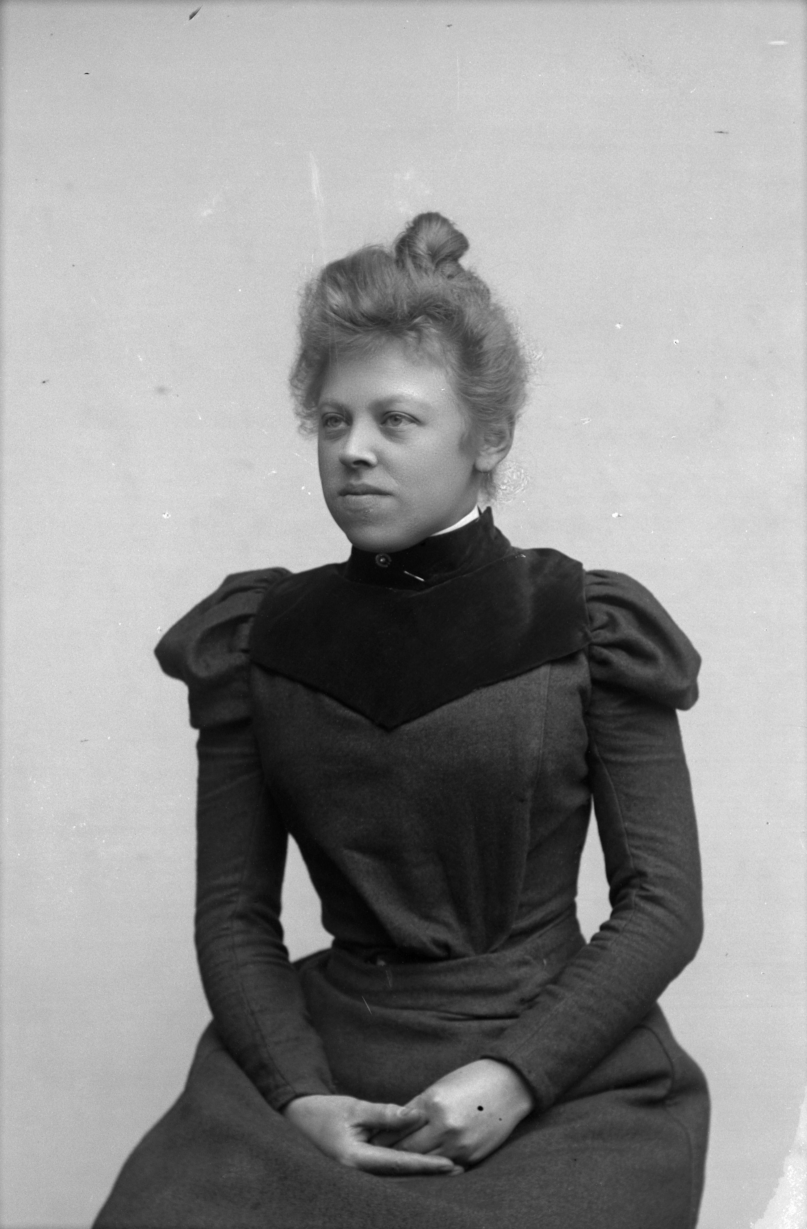 Beskrivning: Porträtt i halvfigur av Hilma Nilsson.