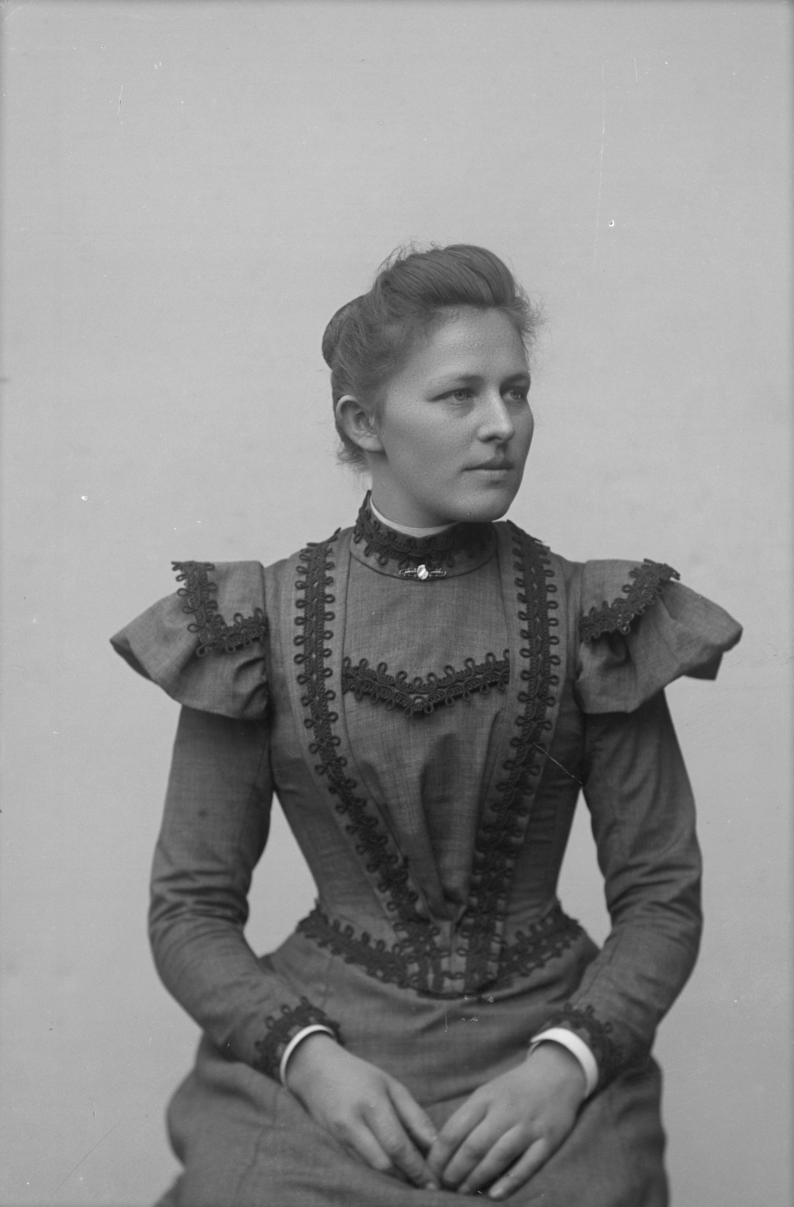 Beskrivning: Porträtt i halvfigur av Minna Nilsson.