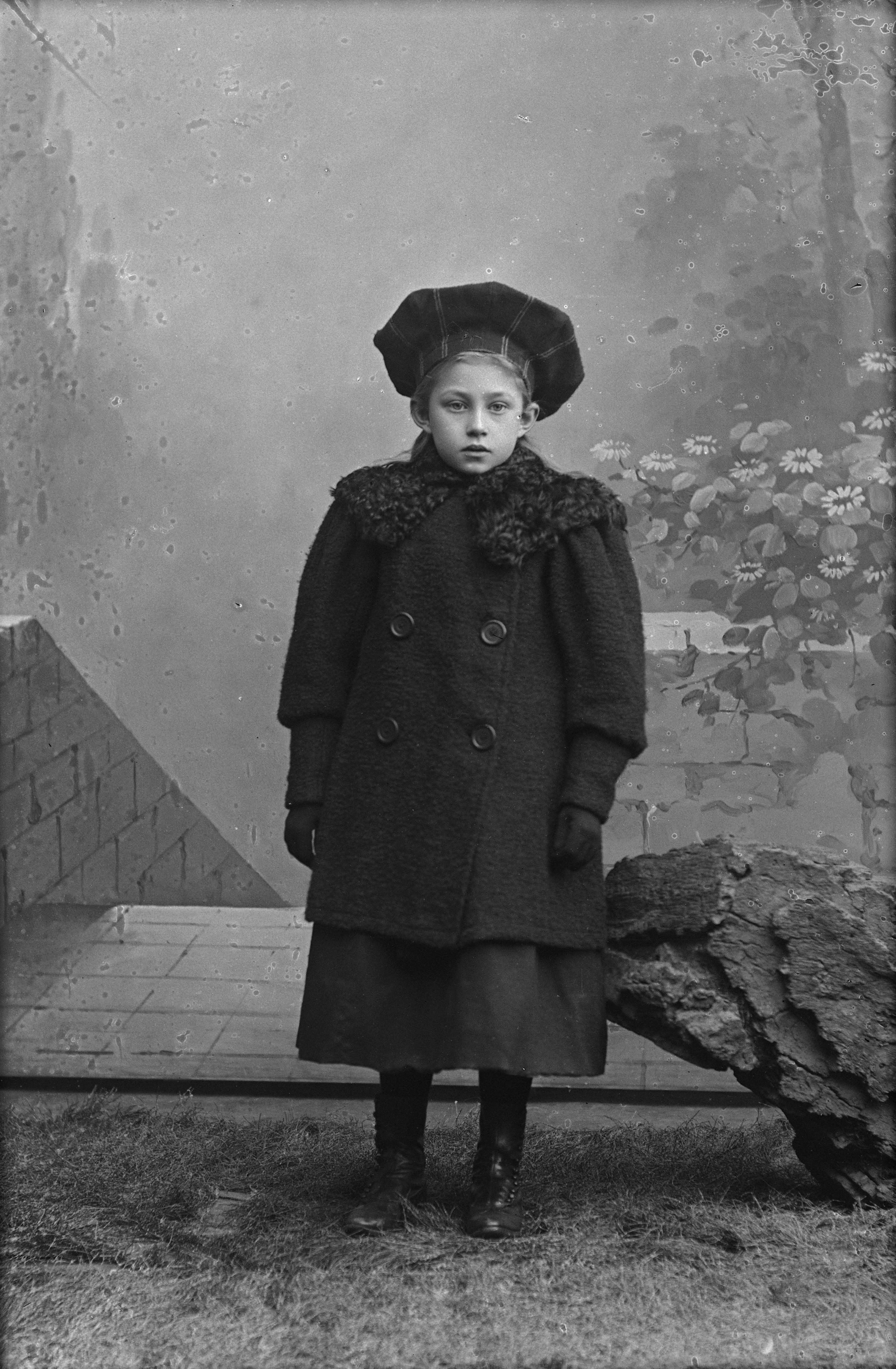 Porträtt i helfigur av Bergs dotter, iklädd ytterkappa och mössa, stående vid stenhäll. Bakom henne, en trappa. Fotograferad framför ateljéfond med skogs- och blomstermotiv.