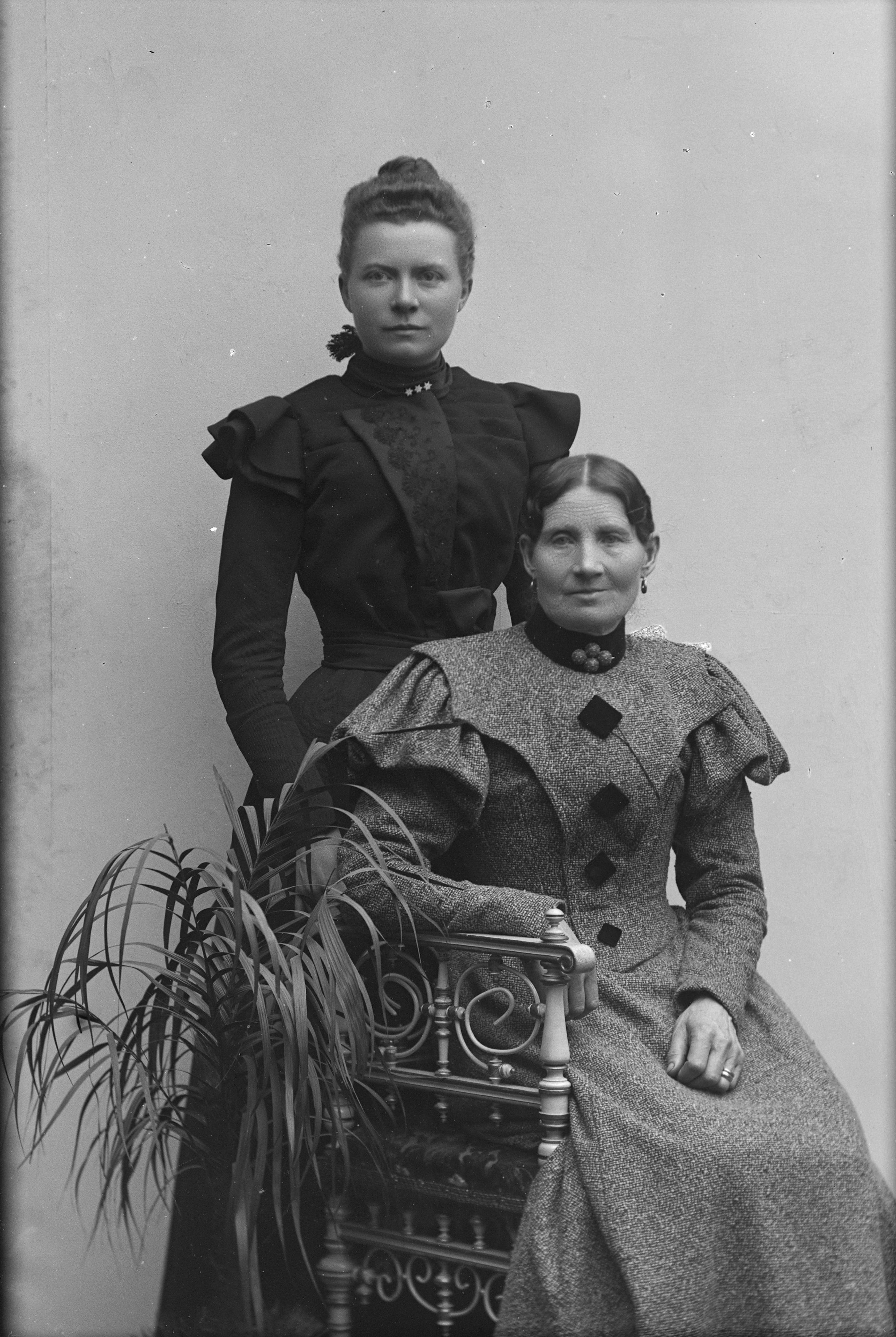 Porträtt i helfigur av Nanna Persson med äldre kvinna. Den äldre kvinnan sittande i stol. Växt stående framför stolen.