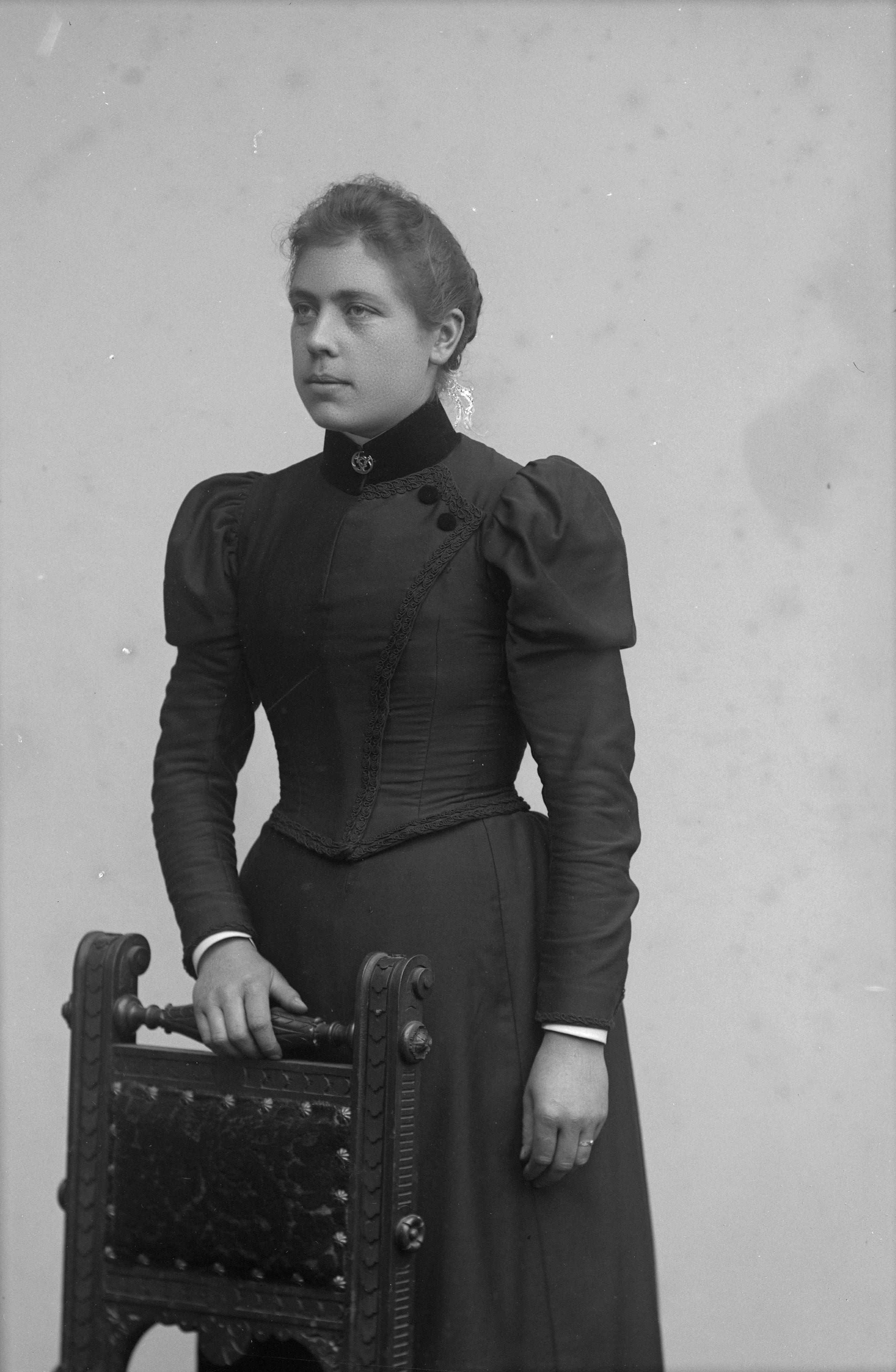 Porträtt i helfigur av Anna Tornberg, stående vid stol.