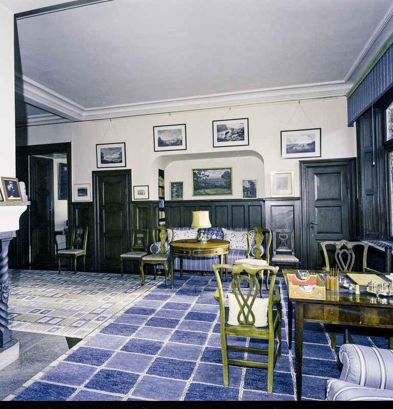 Bilden föreställer ett vardagsrum med ljusa väggar och ett golv med en stor blårutig matta på, och en mindre matta med mindre blå rutor. På nederdelen av väggarna mörk träpanel (jämför 1699-2018). I bakre delen av rummet också tre blåa dörrar med speglar, på övre delen av väggen hänger tavlor. I mitten en alkov med en soffa i ett blått tyg med vita ränder, i soffan ligger kuddar. Framför står ett runt bord i mörkt trä med en bordslampa på. Till höger i bild ett skrivbord i mörkt trä med skrivbordsattiraljer på. Utspridda i rummet stolar med grön stomme och beige klädsel.