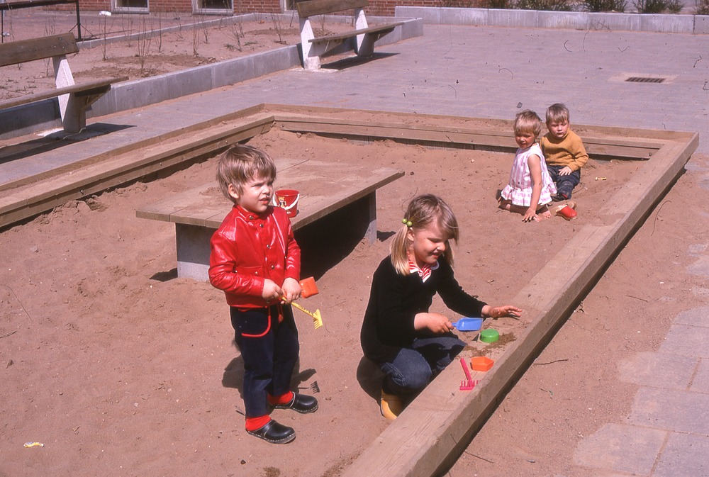 Bilder från stadsdelen Drottninghög. Sandlåda omgiven av plattor, där står bänkar. I sandlådan lekande barn.