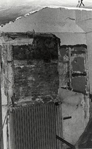 svartvitt fotografi föreställande mellanvägg (korsvirke, lersten, lerklining) Kullagatan 39 kvarter Fiskaren. Från 1974.