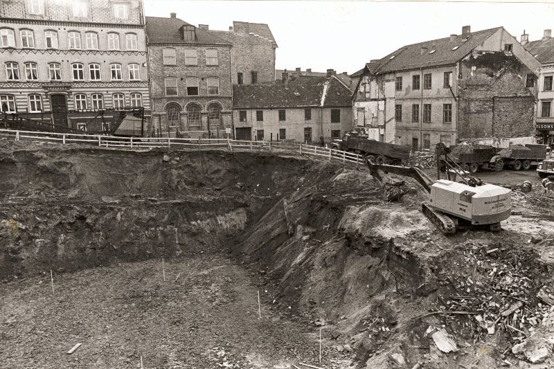 Schaktning för nybyggnad. Bilden visar utgrävd grop med grävmaskin vid kanten, bakom syns äldre fastigheter där rivning påbörjats.