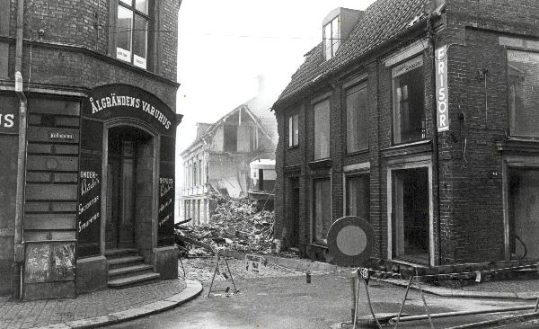 svartvitt fotofgrafi föreställande affärsgata med bl.a. "Ålgrändens varuhus" och rivningsarbete. Kullagatan 39 i kvarter Fiskaren 13, år 1974.