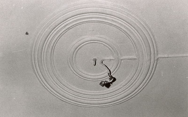 Bilden visar en takstuckatur, runt format med cirkulära motiv, som hörde till hustaket som fanns på S. Storgatan 13, år 1972.