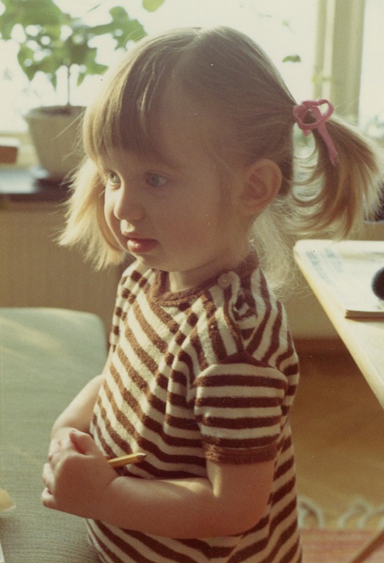 Fotografi föreställande Åsa Liljeqvist 1972 iförd brun-vit randig klänning i frotté, (HeM 1418-2024).