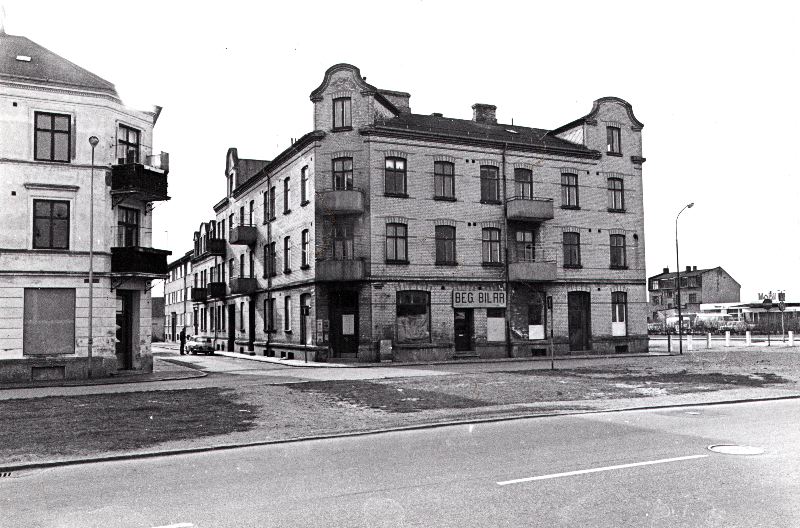 Ett äldre större hyreshus, i bottenvåningen en affär för beg,bilar.