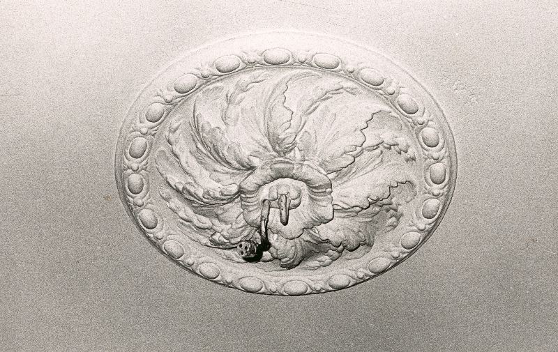 Bilden visar en takstuckatur, på Södra Storgatan 11. På bilden syns en rund formad takstuckatur med blomstermotiv i mitten och geometriska motiv på kanterna.