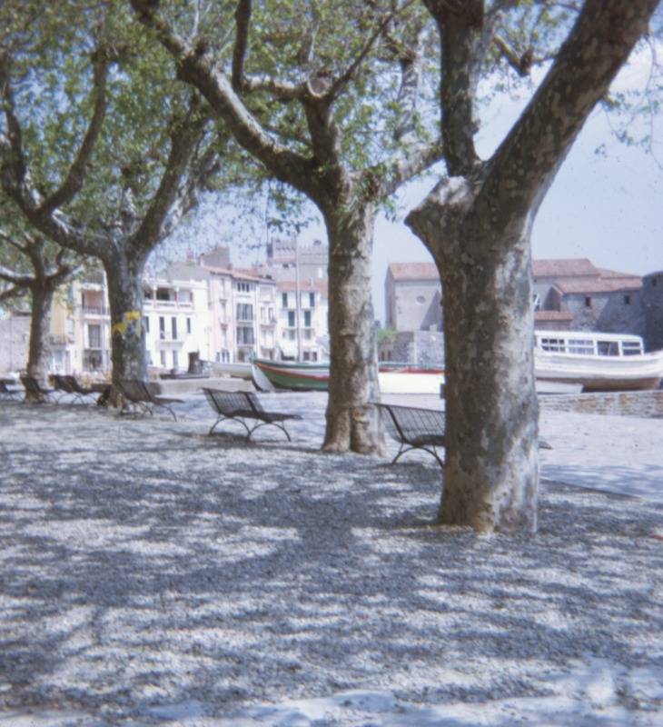 Bilder från Eva Holmberg Jacobssons liv och resor. I förgrunden park med grus på marken samt med träd och bänkar. I bakgrunden byggnader, flervåningshus.