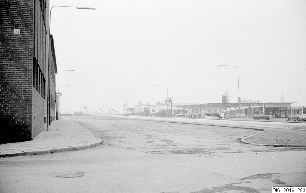 Bilden föreställer Ängeholmsvägen från Ringstorpsvägen mot NÖ från centrum. Mitt i bilden bred gata. Till vänster byggnad med trottoar och i bakgrunden diffus bebyggelse.