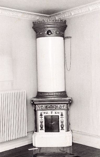 Bilden visar en byggnadsinteriör med en kakelugn på andra våningen på Södra Storgatan 11. På bilden syns hörnan av en rund kakelugn med blomsterdekorationer och dörrar av gjutjärn.