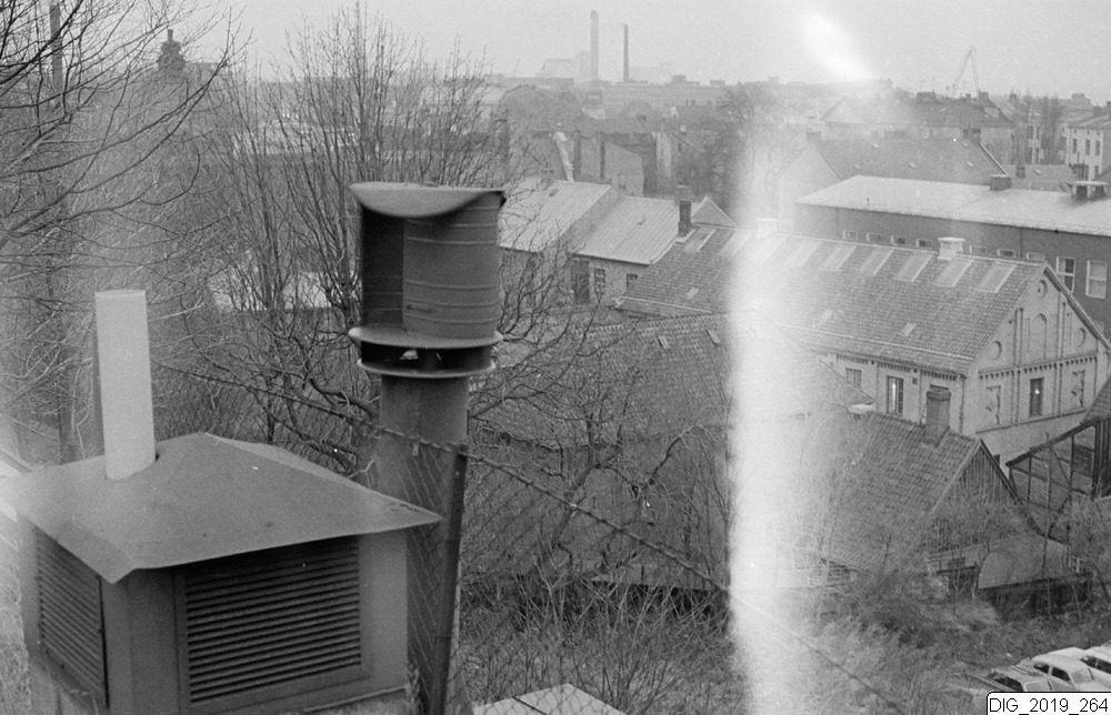 Bilden föreställer Södra Storgatan gården sett från gossis 721200. I förgrunden skorstenar, i bakgrunden en vy av tak.