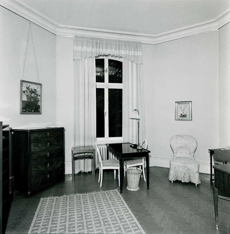 Bilden föreställer ett utsnitt av ett rum, i bakgrunden ett fösnter med gardiner. Till vänster en byrå i mörkt trä med en tavla ovanför. Framför fönstret ett skrivbord med en golvlampa bakom, undertill en papperskorg samt två stolaer med vit stomme och rutig klädsel. Där står ytterligare ett litet bord. Till höger står en fåtölj också med tavla ovanför. På golvet ligger en matta.