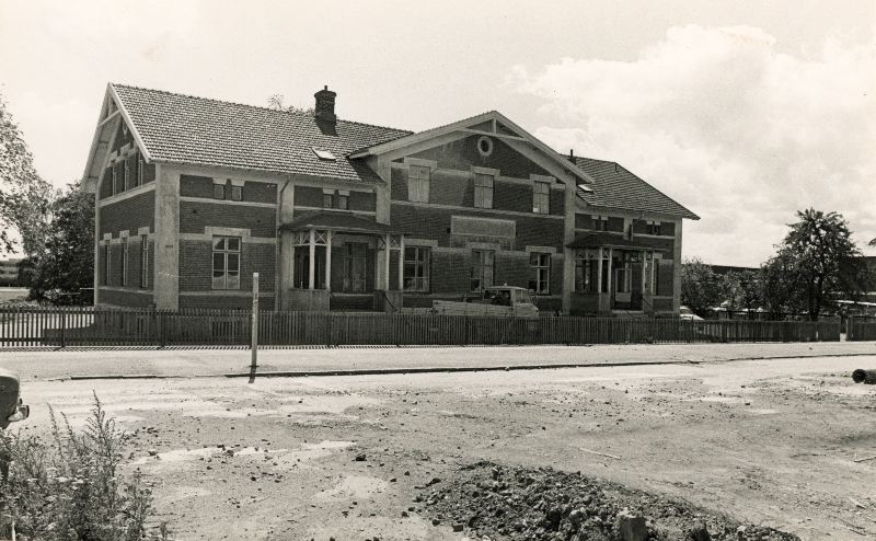 Skolhus med dubbla entréer mot gatan. Staket längs hela skolgården.