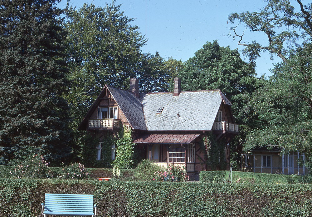 Bilder från stadsdelen Ramlösa, Brunnsparken. I förgrunden bänk. Där bakom häckar och buskar samt en villa inne bland träd.