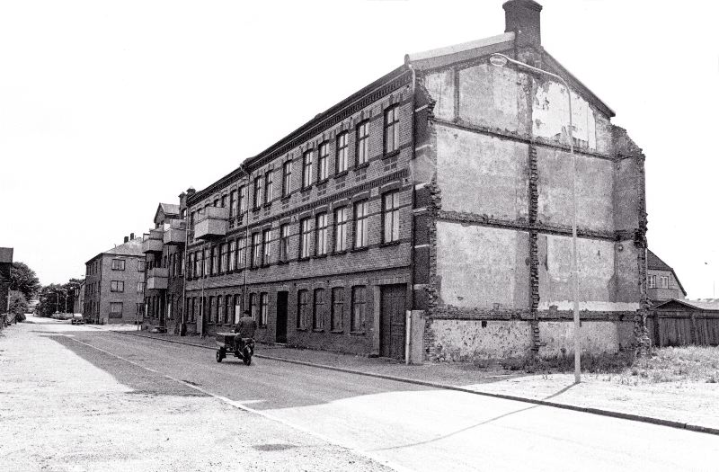 Fotografi på fastighetens gavel och fasad mot gata. Flakmopedist på gatan.