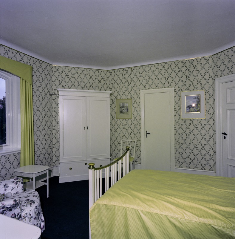 Bilden föreställer ett sovrum med tapetserade väggar, bladgirlanger i ett rut mönster med mörk heltäckningsmatta på golvet (jämför 1684-2018). Till vänster i bilden ett fönster med gulgröna satin (?) gardiner. I bakgrunden ett vitt skåp med låda nedtill. Till höger därom en vit garderobsdörr och på ömse sida två tavlor. I förgrunden del av en säng med vit stomme med guld knoppar samt ett överkast i samma tyg som gardinen. Vid fönstret står ett litet vitt bord.