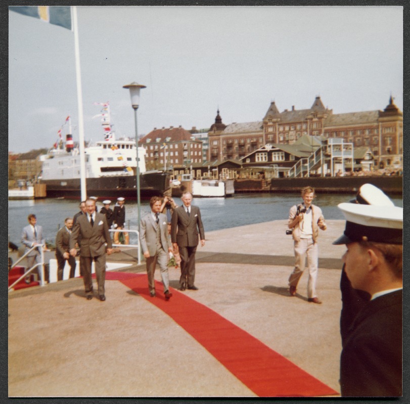 Hamnen i Helsingborgscentrum. I förgrunden är röda mattan utrullad från en båt och som kungen kommer gående på. Omgiven av herrar i kostym samt sjömän i uniform. I bakgrunden Helsingborg centrum med ångfärjestation och färga.