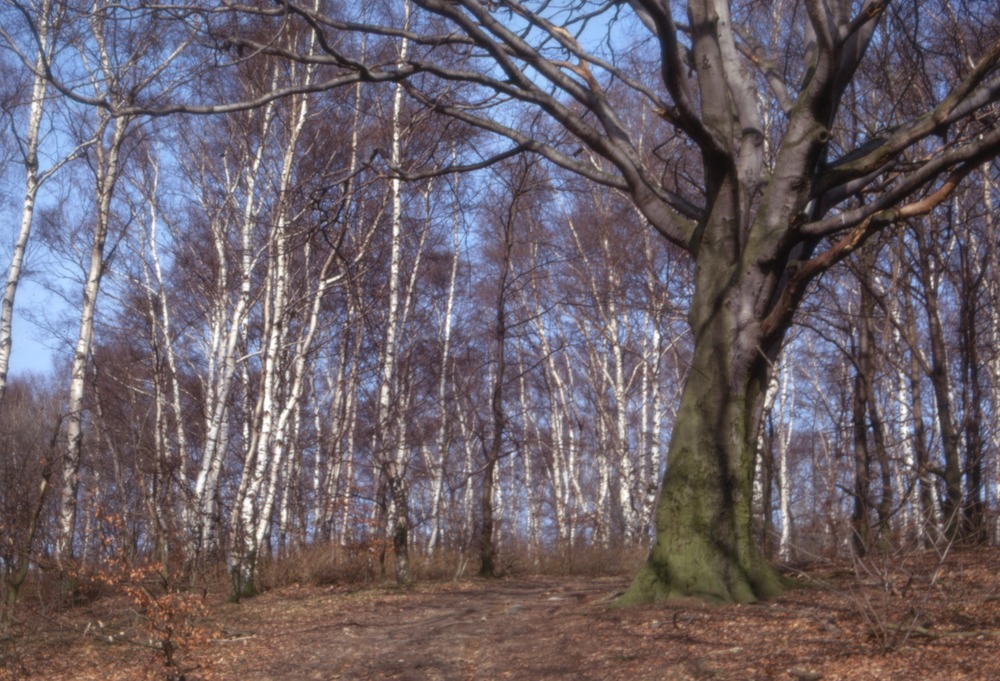 Bilder från stadsdelen Ättekulla. Skogsbacke med björkar och en bok samt en stig.