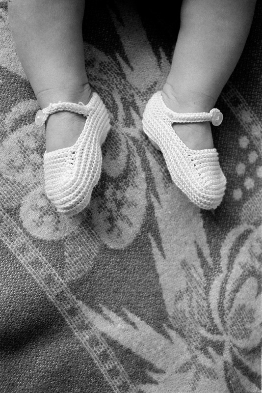 Två små barn ben och fötter med virkade små skor. Undertill troligen en filt. Troligen Jacob.