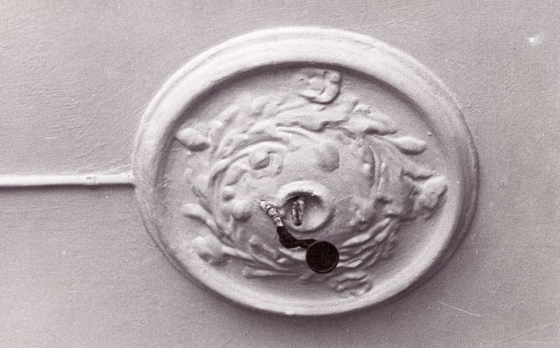 Bilden visar en takstuckatur som hörde till hustaket som fanns på S. Storgatan 13, år 1972. Stuckornamentet är i runt format och med blommotiv.