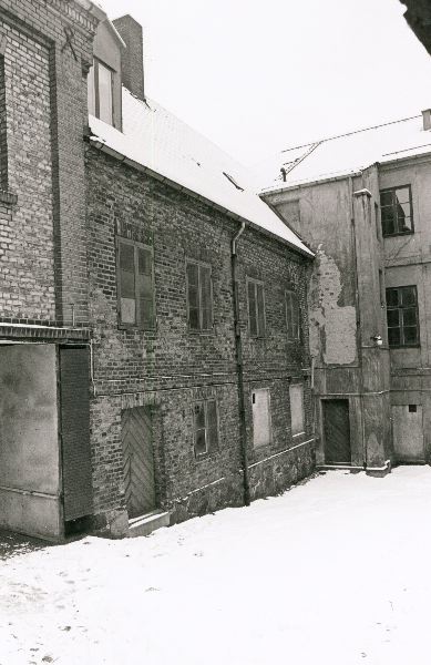 Bilden visar en murad byggnad och en gårdsexteriör på S Storgatan 7, år 1972. På bilden syns byggnadens gavel med en portgång till vänster. Byggnaden är en två våningsbyggnad med inredd vindsvåning. Det kan vara en bild på apoteket Kärnans gatuhusets södra gavel med spår efter igensatt öppning.