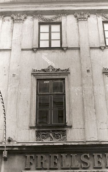 Detaljbild av gatufasad. Bilden visar detalj av fönster ovanför gatuplanet.