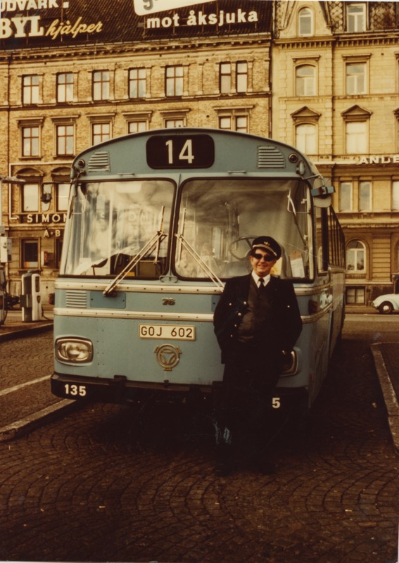Fotografi föreställande en man som står framför Scania Vabis buss vagn 135. Mannen är förare Olav Engdahl. Linje 14 Hamntorget - Eskilsminne. Fotograferat 1974-1975.
