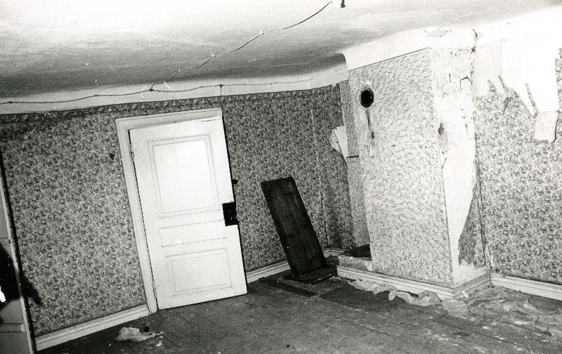 En bild av ett vindsrum där tapeterna har börjat släppa från väggen, Pilshults gård.