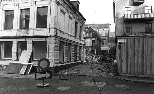 svartvitt fotografi föreställande rivningsarbete i Ålgränden 1974. I kvarter Fiskaren 13.