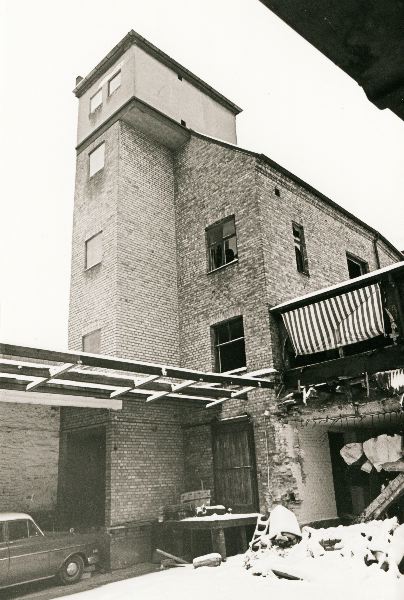Bilden visar en gårdsexteriör på S Storgatan, år 1972. På bilden syns en gårdsplan med en låg flygelbyggnad och gårdssidan av en hög byggnad i bakgrunden. Under flygelbyggnadens tak syns en parkerad bil samt diverse byggnadsmaterial. Till höger syns en delvis riven byggnad.