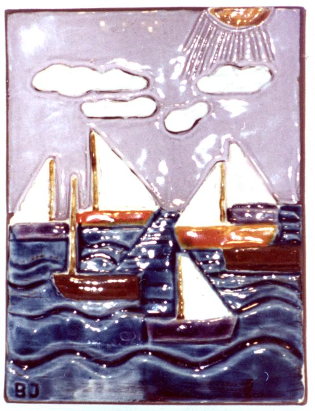Fotografi föreställande en keramiktavla med segelbåtar på vattnet. På baksidan står det noterat: 619 (alt. 69), Brita Jönsson. Stämplat Kodak okt 74.