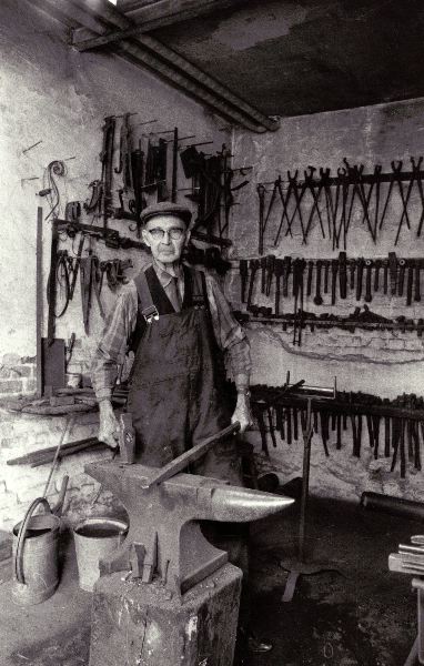 Fotografi som visar smeden Enoch Nilsson arbetande i smedjan. Ett städ samt ett flertal verktyg på väggen bakom smeden.