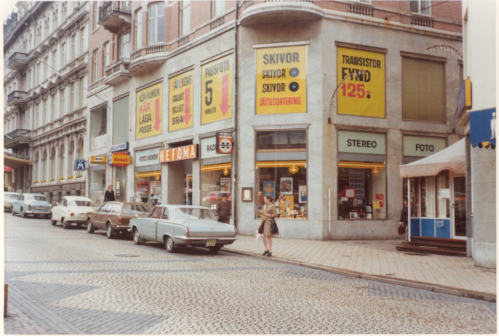 Färgfotografi från 1974-05-xx som avbildar utsidan av Hefomas affär på Stortorget 16.