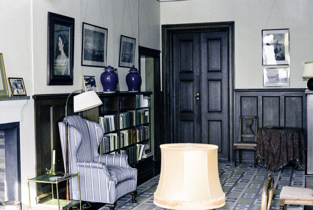 Bilden föreställer en hörna av ett rum med mörk dörr med speglar i bakgrunden (Jämför 1712-2018). Väggarna har träpanel som är mörk nedtill och vit upptill. Där hänger flera tavlor. Utmed vänster vägg en låg bokhylla på vilken står två blå urnor och ett fotografi. I förgrunden en öronlappsfåtölj klädd med randigt tyg i blått, vitt och grönt. Intill står en golvlampa med vit skärm och ett litet serveringsbord i mässing. I förgrunden en aprikos lampskärm och bak till höger ett bord med en hellång duk i mörkt tyg samt en stol med stomme av mörkt trä.