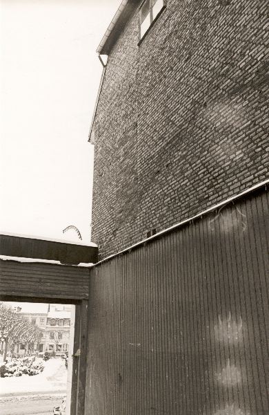 Gårdsexteriör, foto mot sydväst. Gavelfasad med trä och tegel.