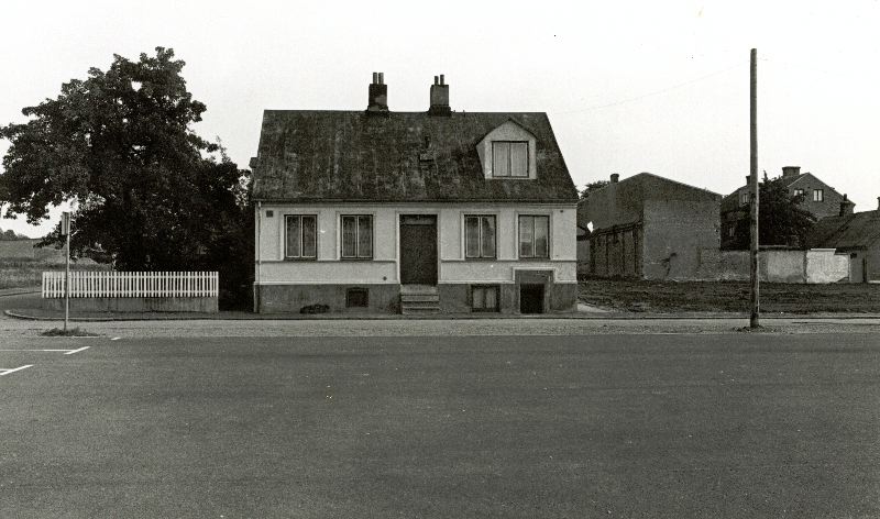 Villafastighet i vägkorsning sedd från större parkeringsplats. Telestolpe i trä på ena sidan vägen med luftburen ledning över vägen till huset.