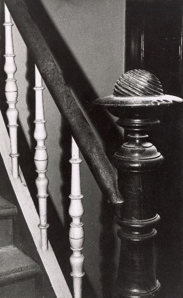 Bilden visar ett trappräcke med trädekorationer i ljusare färg och mörka spiralformade motiv på ledstången, på Södra Storgatan 11.