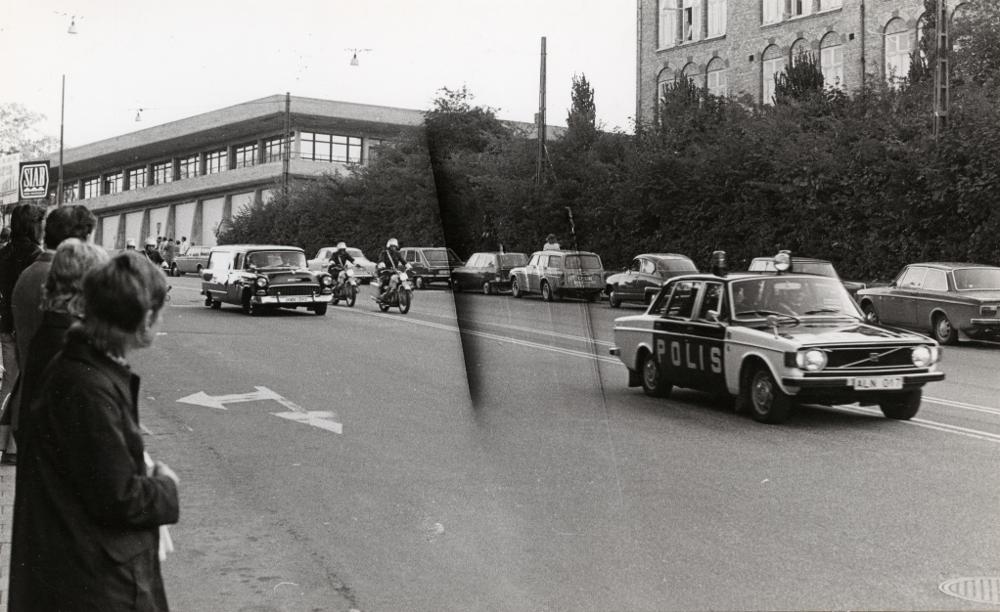 Svartvit fotografi. Gustaf VI Adols kista förs från Helsingborg. 1973.