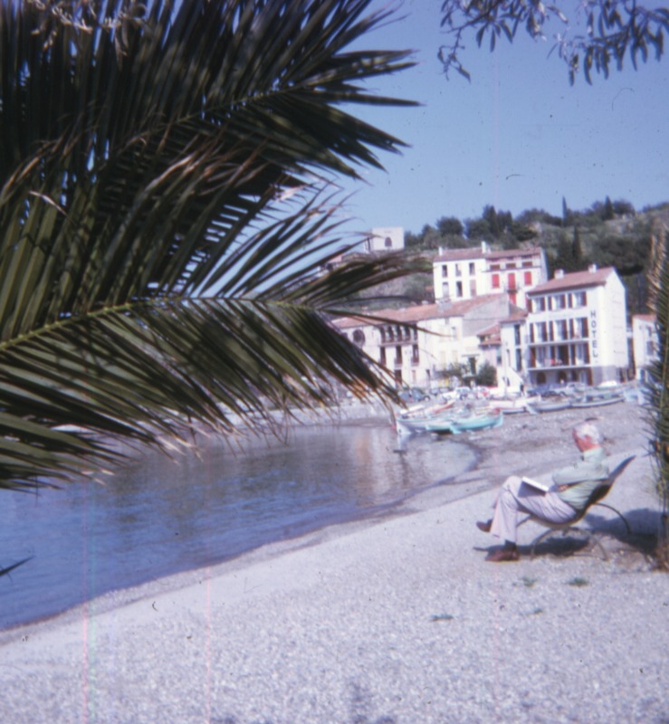 Bilder från Eva Holmberg Jacobssons liv och resor. I förgrunden palmblad och strand. I en solstol sitter Karl-Erik. I bakgrunden flervåningshus och en kulle.