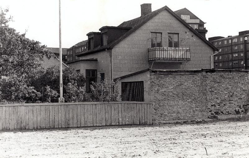 Villafastighet med gavelbalkong ovanför murverk. Huset klätt med eternitplattor.