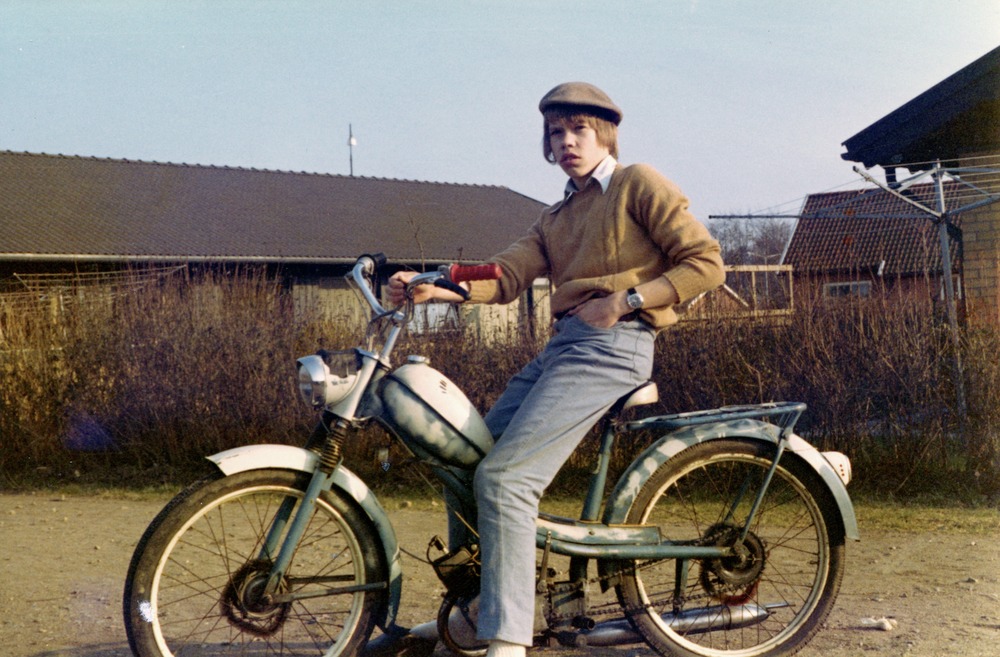 Bilden visar Johan Ström på hans 15-årsdag. Han sitter på mopeden han fått i present. Bilden troligen tagen på hans hemadress, Sigtunagatan 13.