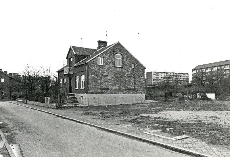 Villafastighet med låg mur mot gatan. Trappa upp mot entré från sidan och gavel i tegel med spår av tidigare fönster.