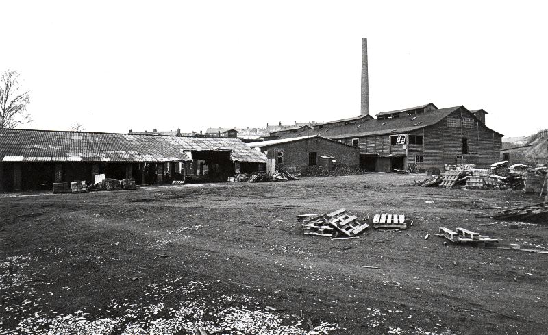 En bild fotograferad av Ångtegelbruket , mycket skräp framför. Ångtegelbruket revs 1974.