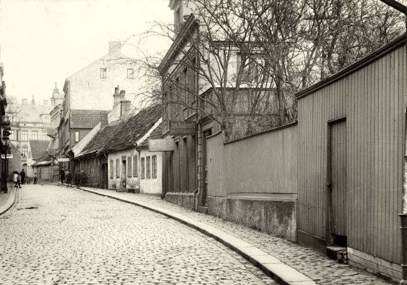 Prästgatan från väster med den till museet flyttade byggnaden, detaljförstoring av 17-167. Foto på foto.